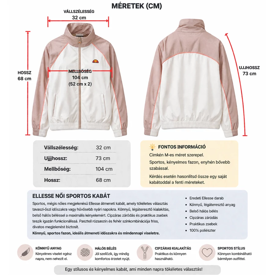A kabát könnyű, légáteresztő kialakítású, belső hálós béléssel, így kényelmes viselet akár aktívabb napokon is. A cipzáras záródás és a praktikus zsebek biztosítják a funkcionalitást, míg a pasztell rózsaszín és fehér színkombináció friss, divatos megjelenést ad.