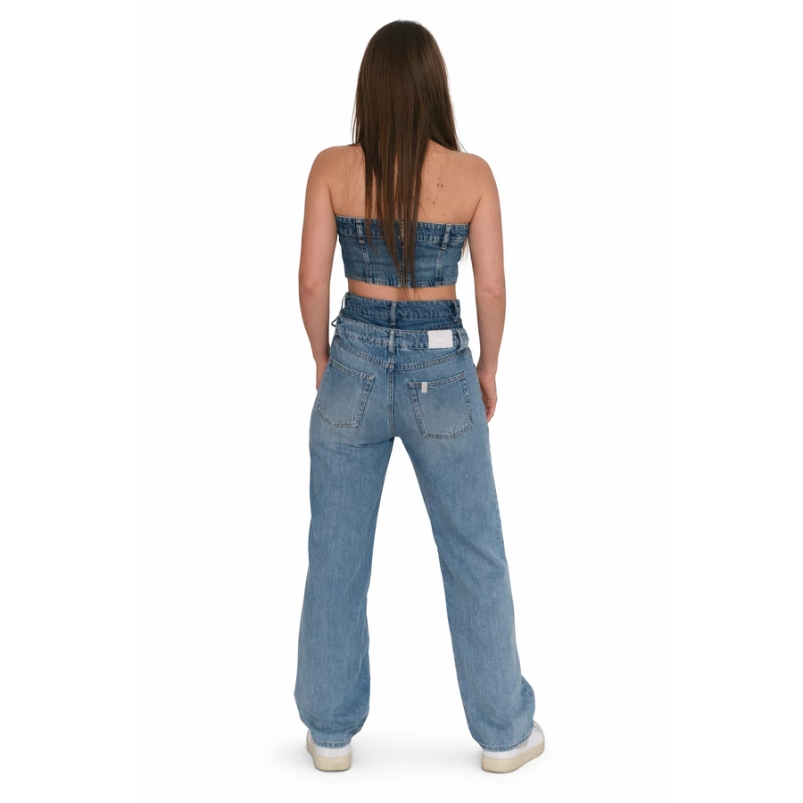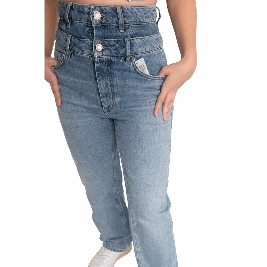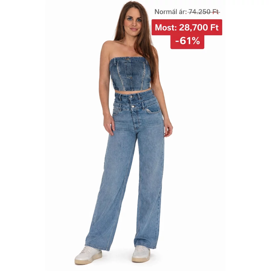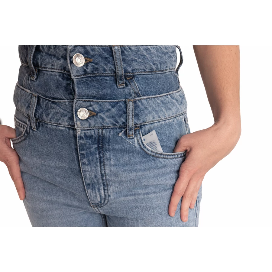 Az extra magas derekú kialakítás (37 cm) szépen kiemeli a derekat, optikailag nyújtja a lábakat, és karcsúbb sziluettet ad. A dupla gombos megoldás modern, karakteres megjelenést biztosít, miközben stabil tartást ad viselés közben.