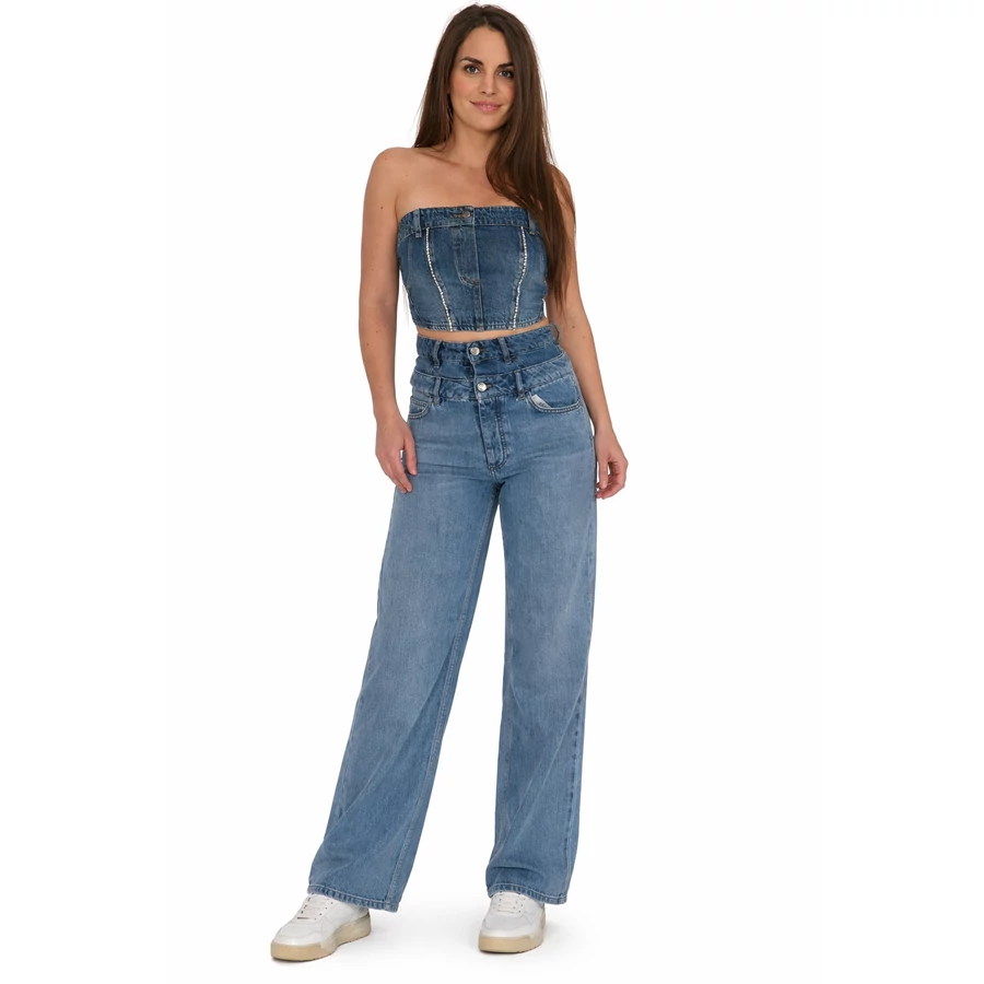 A modellen látható Liu Jo strasszos topp külön is elérhető webshopunkban. Színben enyhén eltér, így egy modern, trendi farmer összeállítást alkot a nadrággal.