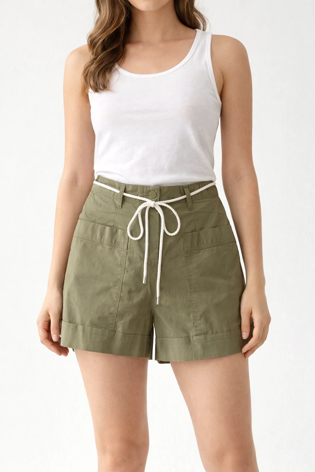 Magas derekú fazon, dekoratív kötős övvel és praktikus zsebekkel.